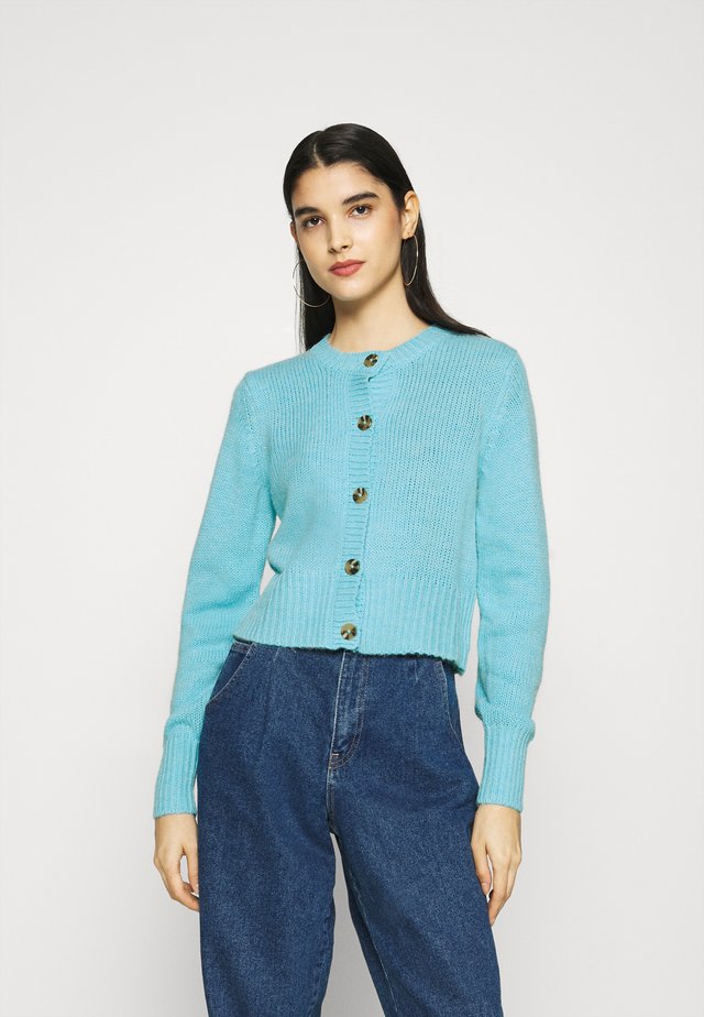 Cardigans Ben Petroleumsfarvet Cardigan Med Lange Rmer Samt Front Der G R Ned I To Spidser