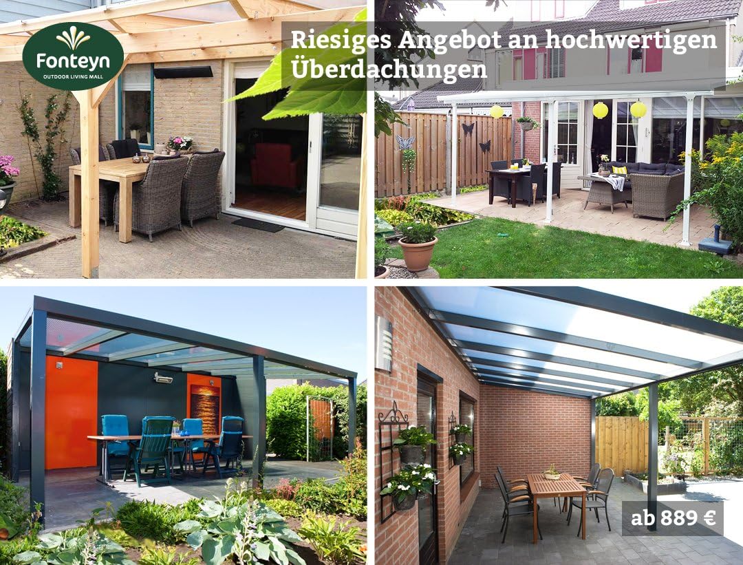 Dabei ist die exklusive FonteynQualität auch sehr preiswert. Hochwertige ALU Terrassenüberdachung / Veranda – 4 x 300 (BxT) / Überdachung Palram Feria Grau € 1549,00 € 1199,00 Zum Produkt gehen Angebot!. Fonteyn bietet darum ein riesiges Angebot an Überdachungen an, wovon der Großteil in unserem schönen Showroom präsentiert werden Unsere engagierten Speziallisten können Ihnen jederzeit gezielte Ratschläge bieten, um Ihre Entscheidung zu vereinfachen Sie sind herzlich dazu eingeladen einen inspirierenden Rundgang zu nehmen.