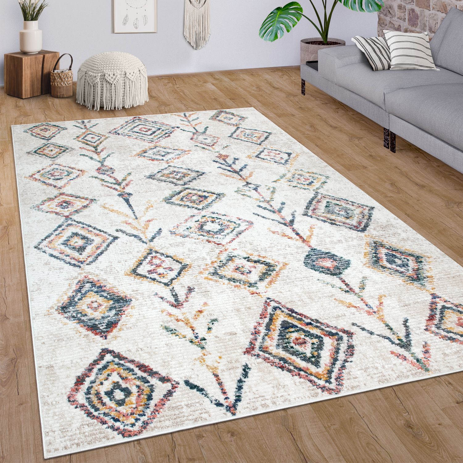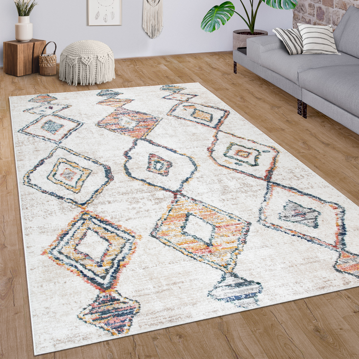 Teppich Wohnzimmer Kurzflor Ethno Boho Rauten 3d Muster Modern Creme Bunt Kaufen Bei Diva Teppich Center