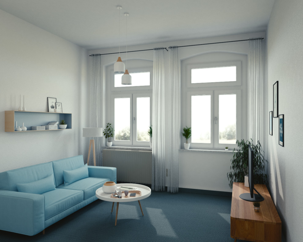 Wohnzimmer Einrichten Ideen Flachenvorhange Wohnzimmer Einrichten Hellblaues Sofa Kleiner Cou In Living Room Blinds Roller Blinds Living Room Curtains With Blinds