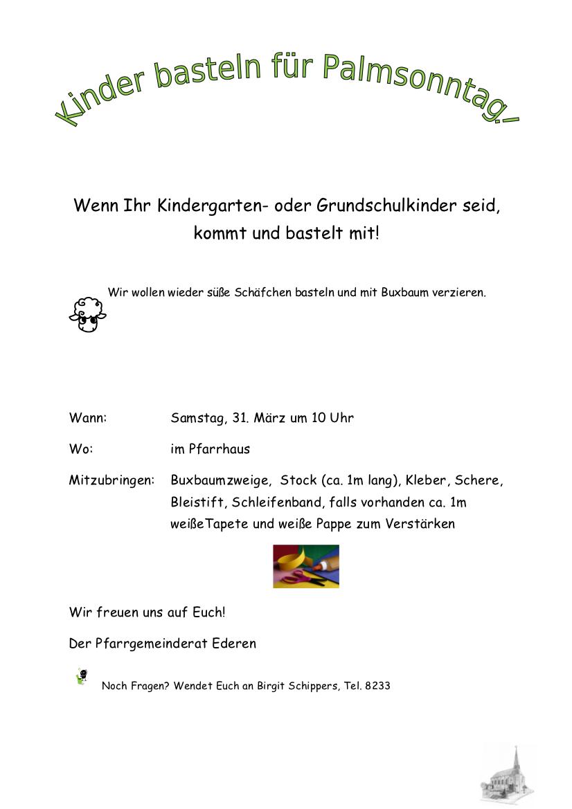 Dieser pinnwand folgen 8 nutzer auf pinterest 42 palmsonntag stock bilder und fotos durchstöbern sie 42 palmsonntag stock fotografie und bilder Zum zeichen seines königtums jubelte das volk ihm zu und streute dem nach jerusalem kommenden palmzweige joh eu mt eu lk eu. Matthäusstube um Palmstöcke zu basteln Hierzu bringen die Kinder einen Stock (5070 cm) mit Diese bringen sie dann am Palmsonntag, 14 April um 0930 Uhr zur Palmweihe am Brunnen vor der Kirche mit, anschl ist Hl Messe Für die jüngeren Kinder findet ein eigener Gottesdienst im Matthäusheim statt Aus dem Gemeindeausschuss. Wwwkidswebde Created Date 3/23/12 AM.
