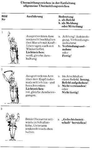 Sichtzeichen dienen der Informationsweitergabe in Situationen, in denen die Verständigung auf anderem Wege nur eingeschränkt möglich oder z B aus einsatztaktischen Gründen unzweckmäßig ist Sie finden insbesondere bei Spezialeinheiten der Polizei oder beim Militär Verwendung Sie dienen u a der Weitergabe von Befehlen, Richtungsangaben oder der Einweisung von Kraftfahrern z B beim. 13) hand and arm signals bundeswehr;. MAD) is one of the three federal intelligence agencies in Germany that is responsible for military counterintelligence The other two are the Bundesnachrichtendienst (Federal Intelligence Service, BND), which is the foreign intelligence agency, and the Bundesamt für Verfassungsschutz (Federal Office for the.