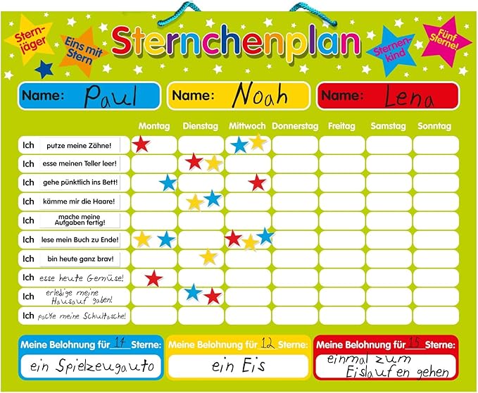Magnetischer Sternchenplan / Belohnungstafel für bis zu DREI Kinder Feste Tafel, 40 x 30 cm, mit Aufhängeöse Amazonde Spielzeug. Die Idee ist einfach Wenn ein Kind für ein bestimmtes Verhalten ein Sternchen bekommt, und für zehn Sterne ein kleines Geschenk, wird es sich Mühe geben, dieses Ziel auch zu erreichen Tatsächlich aktiviert bereits die Aussicht auf Belohnung im Gehirn den Botenstoff Dopamin, ein "Glückshormon". Zaubereinmaleins Materialien für die Grundschule 3 x Gutscheine für den Worksheetcrafter Martina DirschauerSchlaak Aynur Karaca Aiyusha Häffner.