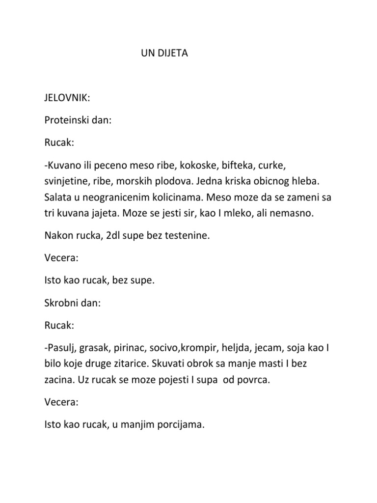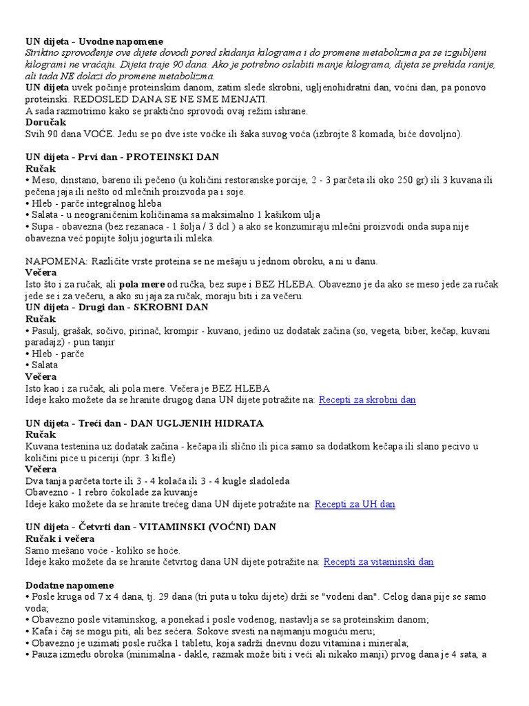 Стриктното спроведување на оваа диета доведува, покрај намалувањето на килограмите, и до промена на метаболизамот па затоа изгубените килограми не се враќаат. Un Dijeta recepti Svakodnevni jelovnik za Vašu UnDijetu Recepti za proteinski dan, skrobni dan, ugljenohidratni dan i voćni dan. UN dijeta – Pravila Postoje određena pravila ishrane koje morate slediti kako biste izgubili težinu na siguran i zdrav način Strogo sledite redosled dana (dan proteina, skroba, ugljeni hidrata, voća).