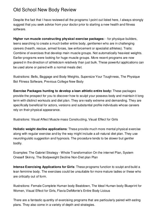 Old School New Body Diet BranchedChain Amino Acids (BCAA’s) BCAA’s have become popular among athletes and Old School New Body recommends taking Phosphatidylserine This is another supplement they recommend It’s meant to reduce cortisol levels Cortisol is known Caffeine and LCarnitine The. Your Parents Probably Tried These OldSchool Diet Tips Gallery Back before people knew anything about healthy fats, antioxidants, or protein, people were really just stumbling blindly through unsubstantiated diet advice and weight loss tips Though many of the diet regimens on this list were endorsed by doctors and “experts,” few (if any. The term ‘old school’ refers to bodybuilders of the golden era Of course, you have to choose to make it a priority;.