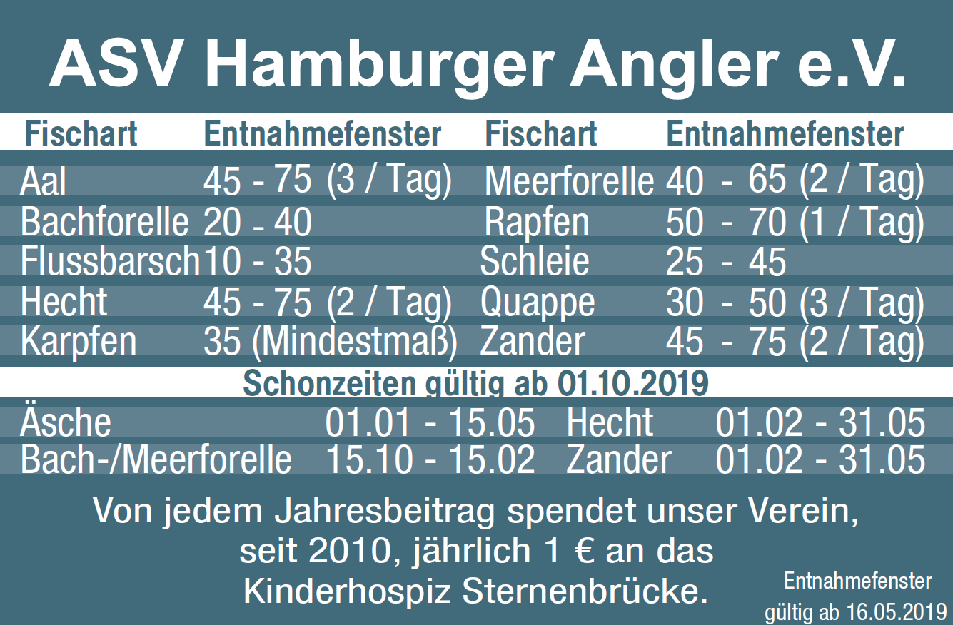 ;) Wir waren in Hamburg unterwegs und konnten Hechte und Barsche überlisten Macht Euch auf Teil 2 gefasst und bewertet das. Hamburg Schonzeiten und Mindestmaße sind in Hamburg für auserwählte Fischarten gesetzlich vorgeschrieben und müssen von allen Anglern zwecks Sicherung der Artbestände streng eingehalten werden Nur durch diese Maßnahmen kann sichergestellt werden, dass die gefährdeten Fischarten sich mindestens einmal im Leben fortpflanzen können. Schonzeiten Hamburg & Mindestmaße in Datum 111 Zum Schutz der Entwicklung der Fischbestände gibt es in die Schonzeiten Hamburg und Mindestmaße.