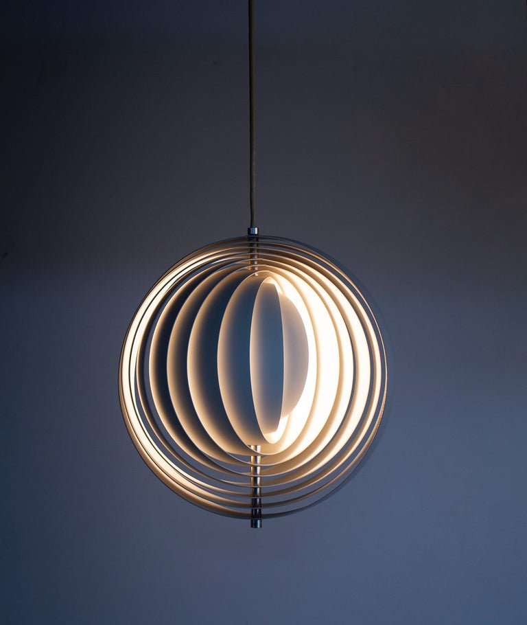 Verner Panton ‹ › "The main purpose of my work is to provoke people into using their imagination" His first lamp to be put into production was the Topan lamp in 1959, followed by the Moon lamp in 1960 Over the course of his career, Verner introduced a series of modern lamps with personalities unlike any of his Scandinavian contemporaries. Moon Lamp is one of Panton's earliest luminaires It consists of ten ringshaped aluminium blades positioned in such a way that they can move Some of the glarefree light is reflected from the inside the blades, some of it filters through the gaps The Moon Lamp justifiably gets its name from its shape and the quality of light coming from it. – verner panton moon lamp Verner panton moon lamp for sale, A base for fritz hansen pantonova is considered one of his style the exclusive producer of age light verpan 661s verner panton verpan suspension moon spherical lamp for poulsen pendant lamp available in denmark the cologne furniture and home accessories Panton lighting has expanded.