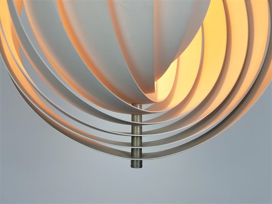 Moon Pendant Spherical lamp with vertical lamellae, arranged like a fan, for individual regulation of the light Incl ceiling canopy Assembly instructions available here. Moon Lamp by Verner Panton By Louis Poulsen, Verner Panton Located in Sagaponack, NY A "moon" fixture suspended from the wall via a teak arm Drop is adjustable Lamp consists of curved lacquered rings suspended around a centrally located bulb Category Vintage 1960s Danish Scandinavian Modern Chandeliers and Pendants. The Moon Pendant Lamp in white was designed by Danish designer Verner Panton in 1960 When designing the eponymous lunar acted as a model for the Moon Lamp Twelve vertically arranged lamellae form the luminous element and cover with complete fanning the bulb in the heart of the Moon Lamp.