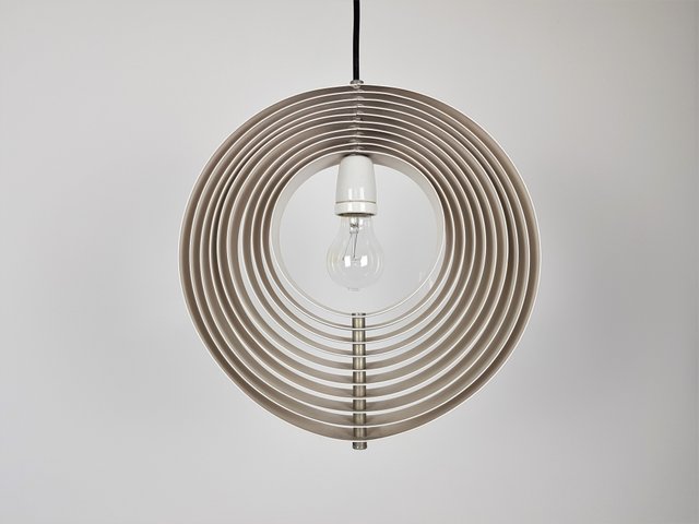 Designed in 1960, the Moon represents one of Verner Panton’s earliest designs in lighting The iconic pendant is characterized by its fanlike design with ten ringshaped aluminum lamellae perfectly positioned to provide a soft, ambient and glarefree light The blades reflect and filters the light and the pendant chan. Verner Panton havde tætte forbindelser til mange af de vigtigste danske designere fra den tid Han var blevet undervist af Poul Henningsen på Københavns Royal Academy of Art Og efter sin eksamen, arbejdede han for en af Danmarks største arkitekter Arne Jacobsen Panton havde også venskab med designerhåndværker, Hans Wegner. Moon Lamp by Verner Panton for Louis Moon Ceiling Lamp by Verner Panton for Moon Lamp light fixture designed by pendant lamp by Verner Panton small pendant lamp by Verner Panton Moon Ceiling Lamp By Verner Panton For An Original Verner Panton ‘Moon’ Lamp Vintage Moon Pendant by Verner Panton.