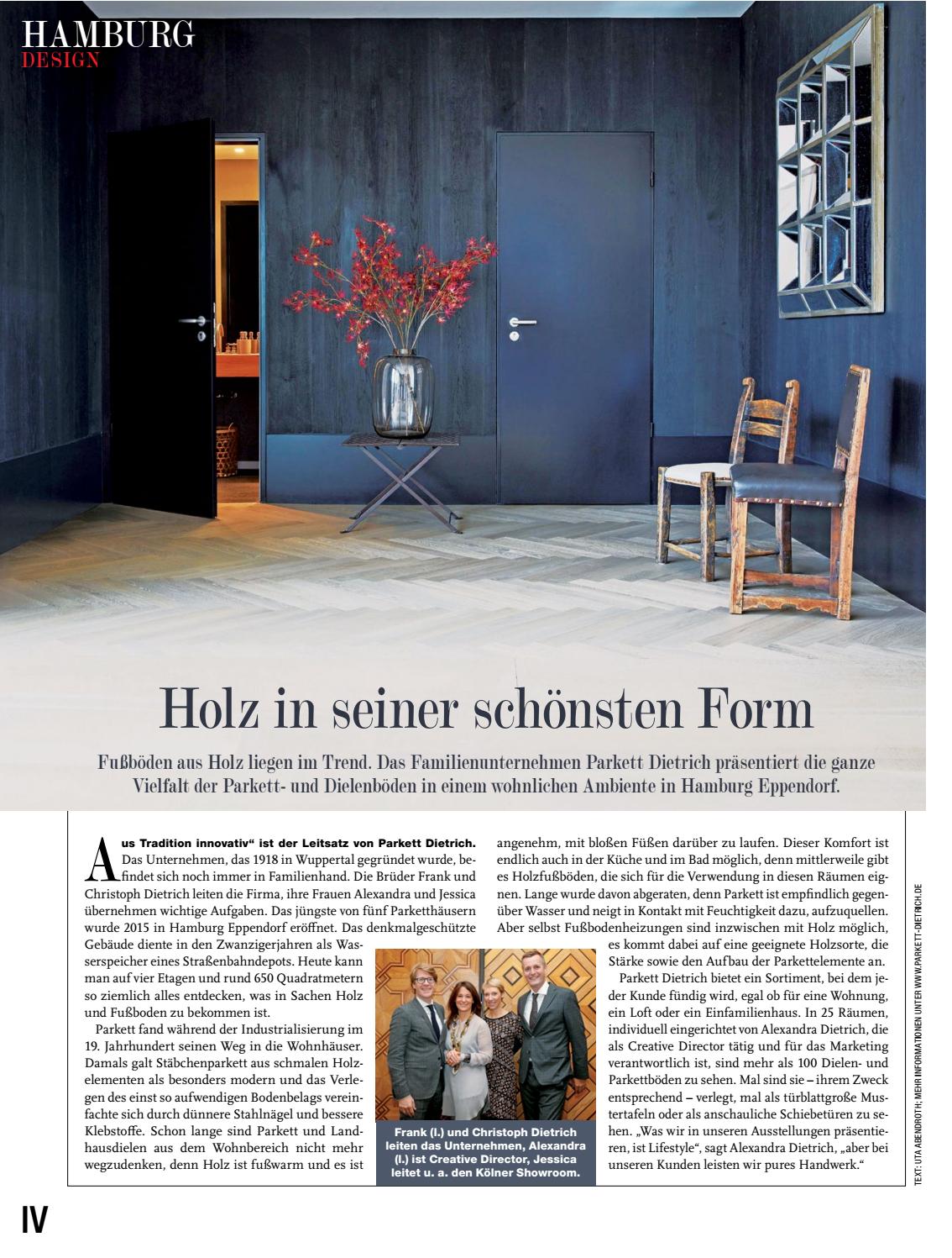 Und in Hamburg ist viel los, nicht nur Privathäuser werden eingerichtet, ganze Hotels und Bürogebäude Groß denken ist für die Familie Dietrich normal Der Großvater Otto besaß 1918 die erste ParkettSchleifmaschine Europas und legte den Grundstein für stetiges Wachstum. Und in Hamburg ist viel los, nicht nur Privathäuser werden eingerichtet, ganze Hotels und Bürogebäude Groß denken ist für die Familie Dietrich normal Der Großvater Otto besaß 1918 die erste ParkettSchleifmaschine Europas und legte den Grundstein für stetiges Wachstum. Der Designaspekt kommt vor allem beim Blick auf die repräsentativen Ausstellungsflächen im Stammhaus Wuppertal, aber auch in den Niederlassungen in Köln, Dortmund, Krefeld und Hamburg zum Ausdruck Dort inszeniert Parkett Dietrich seine Holzböden auf gut 5600 Quadratmetern so, dass das traditionsreiche Handwerk zur modernen.