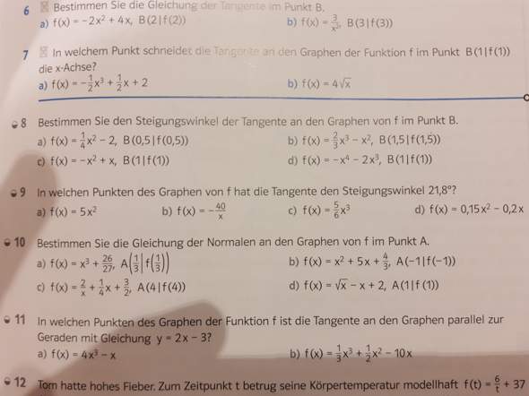 A 96 Bestimme die Gleichung der Tangente t an das Schaubild von f mit𝑓(𝑥) = 1 4 𝑥 4 −𝑥 2 1 im Punkt 𝑃(2 𝑓(2)) 11. Lerne die Steigung einer Funktion zu berechnen ⇒ Hier findest du Berechnungen der Steigung bei Geraden und bei Graphen in einem bestimmten Punkt sowie die Berechnung des Steigungswinkels Mit Erklärungen und Beispielaufgaben Lernen mit Serlo. Wenn ja, dann schneidet die Tangente ja die xAchse und da könnte man vllt irgendwas mit sin, cos und tan machen (Eins davon ist sehr sinnvoll ).