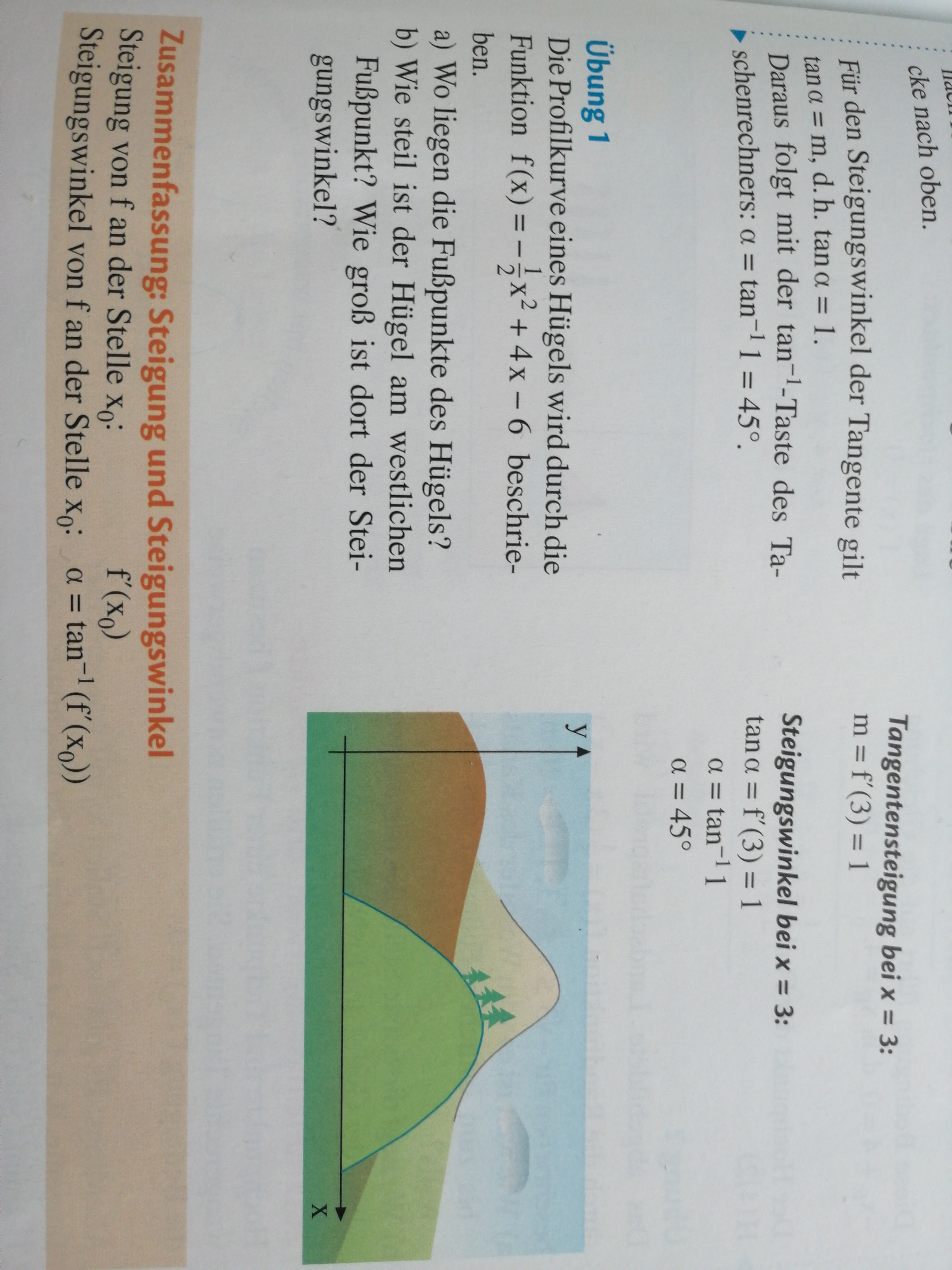 A) Steigungswinkel α 4' f (x) = −2x 6'f ( − 1) = tan α = 6 α = 80 ,5 ° b) Gleichung der Tangente m = 6 und f( − 1) = −7 −7 = 6⋅(− 1) n n = −1 f T (x) = 6x −1 c) Gleichung der Normale 6 m = − 1 43 7 n 6 − = 1 6 n = − 6 43 6 1 f N (x) = x− 3) f(x) = x −1, x 0 = 3 a) Steigungswinkel α 2 x 1. Erklären Sie, dass der blaue Winkel Steigungswinkel genannt wird. Der Steigungswinkel liegt immer zwischen $90°$ und $90°$ (bei negativem Steigungswinkel fällt der Graph), deswegen kann man für dessen Berechnung immer die $\tan^{1}$Taste benutzen Bei Geometrieaufgaben, wo stumpfe Winkel gesucht sind, musst du $180°$ zum Ergebnis addieren.