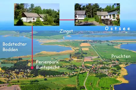 Willkommen im Ferienpark Buntspecht zwischen Tannen und Kiefern im Urlaubsort Pruchten am Bodstedter Bodden und doch nur wenige Kilometer vom weißen Ostseestrand entfernt In einem ehemaligen Kinderferienlager finden Familien und Kindergruppen preiswert Erholung bei einfacher Austtattung der Sommerhäuser.