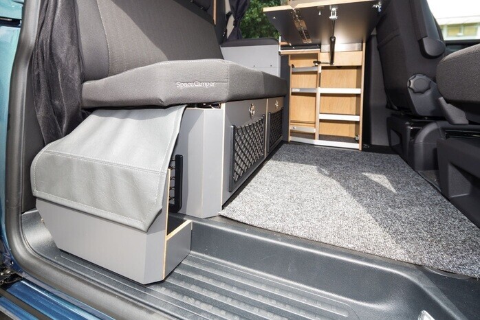 SpaceCamper Limited Viele Highlights in Serie Unser limitiertes Serienmodell mit 150 PS, einem Bett über die gesamte Fahrzeugbreite, einer kompakten Küche, LuftStandheizung, Rückfahrkamera, 3 Batterien, Heckdusche und vielen weiteren Extras!. Der Limited ist wie alle SpaceCamper ein wahres Raumwunder und bietet viel Stauraum für großes und kleines Zubehör, zum Beispiel in Schubladen unter der Sitzfläche und in dem Schuhschrank neben der Rücksitzbank, der zu einem Tisch nach außen aufgeklappt werden kann. Der SpaceCamper VW T61 Ausbau alltagstauglich, praktisch, bequem Vielseitig unterwegs PKW, Transporter und Wohnmobil in einem.