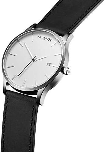 Black dial enhanced by silvertone hands Black PVD stainless steel case with a black (synthetic) leather band Quartz movement 50 meters / 165 feet water resistance Fixed bezel Scratch Resistant Mineral crystal Solid caseback Tang clasp Pull / Push crown Case size 45 mm x 10 mm Band 24 mm x long MVMT MM01BBRGL Classic Watch. Dial black with date window ;. Suit up with MVMT’s 40 Series, a sophisticated and dressier spin on the classic design – the perfect everyday minimalist watch for men This 40mm watch is a slimmer, lightweight timepiece that looks sleek and sits flat on your wrist perfect for the office or any special event.