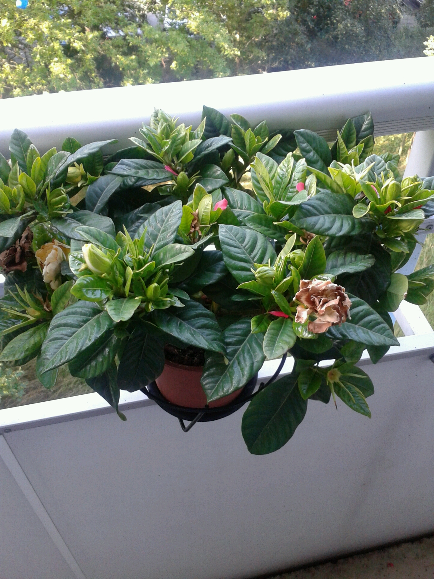 Die Gardenie gilt in der Pflege als schwierig, ist nach meinen Beobachtungen aber robuster als ihr Ruf Gut wächst sie an einem ganzjährig hellen bis sonnigen Standort Während der heißen Sommerwochen sollte sie aber mit Abstand von 50 bis 100 Zenteimter zum Fenster stehen, je nachdem wie intensiv die Besonnung dort ist. – Spinnmilben mögen es warm und trocken. Dort soll man die Gardenie als abführende Heilpflanze verwenden!.