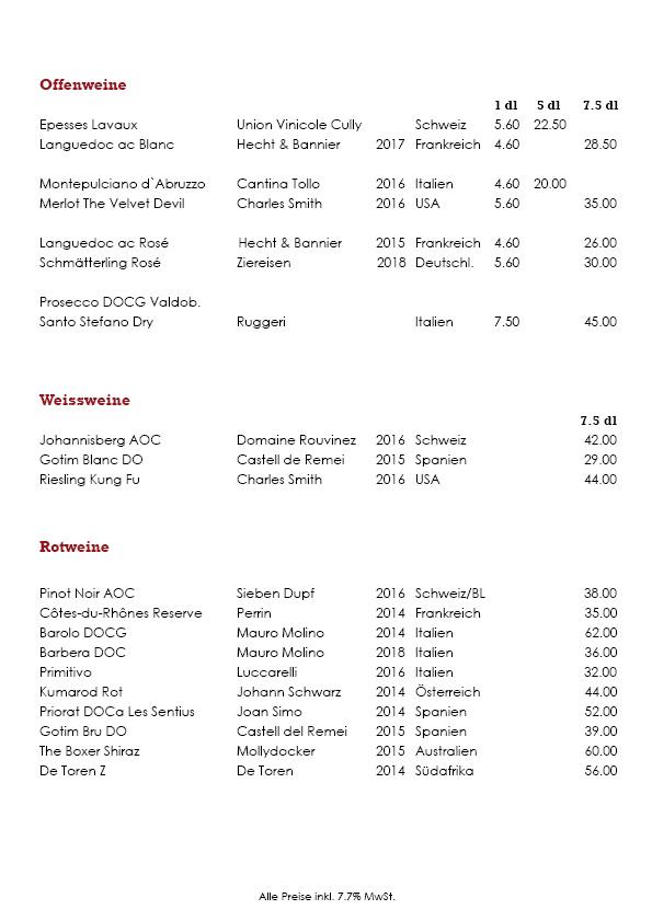 Getrankekarte Gasthaus Rossberg Schindellegi