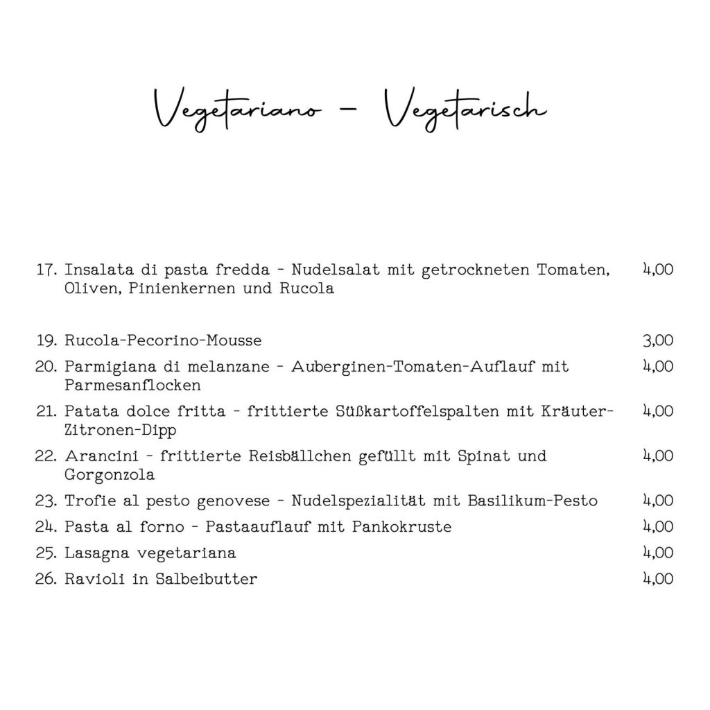 Wir sind das italienische Restaurant in Berlin Steglitz Genießen Sie unsere authentische italienische Küche und lassen Sie sich von unseren kulinarischen Genüssen in die Welt Italiens entführen. Geniessen Sie Pizzen und italienische Küche in Unterendingen Rufen Sie an > 056 558 63 15. Unsere Speise & Getränkekarte Zuppe – Suppen 1 Crema di pomodoro Tomatencremesuppe 4,50 € 2 Minestrone Italienische Gemüsesuppe 5,00 € 3 Erbata Kartoffel – Spinatsuppe 5,00 € 4 Stracciatella mit Parmesan–Ei 500 € Antipasti – Vorspeisen 11 Cocktail di gamberi Krabben in Cocktailsoße 8,00 € 12 Vitello tonnato Dünn geschnittenes Kalbsfleisch mit Thunfischsauce 8,50 €.