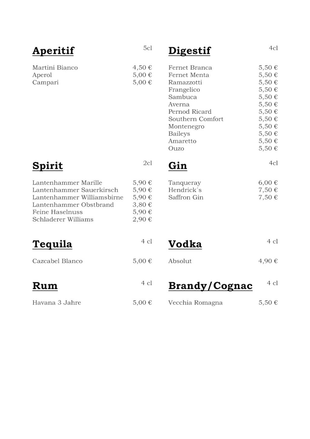 Das italienische familienbetriebene Restaurant Sempre wurde 19 eröffnet und befindet sich seit 1974 in Berlin Mariendorf Wir bieten traditionelle italienische Speisen an. Getränkekarte Alcolici / Spirituosen;. Die aktuelle Getränkekarte des Bistro Luigi in Ottobrunn südlich von München Wein, Bier, Wasser, alkoholische Getränke, Softdrinks,.