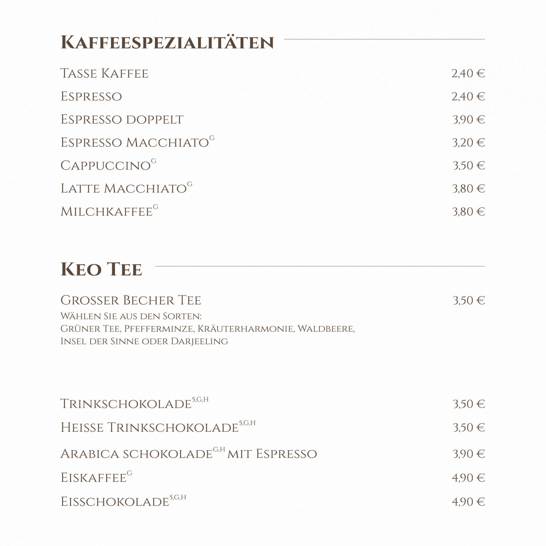 Getränkekarte Alcolici / Spirituosen;. Vini aperti / Offene italienische Weine;. Erfrischende getränke Getränkekarte Heißgetränke Tee Softdrinks Weine Apertiv & Digestiv Prosecco Bier Heißgetränke Café Crema2,40€ Espresso2,€ Latte Macchiato3,00€ Wahlweise mit Kokos oder Karamell Flavour 0,40€ Espresso macchiato2,40€ Espresso doppio3,€ Cappuccino2,90€ Café Latte3,00€ Tee Pfefferminztee2,90€ Schwarzer Tee Darjeeling2,90€ Rooibos Vanille2,90.