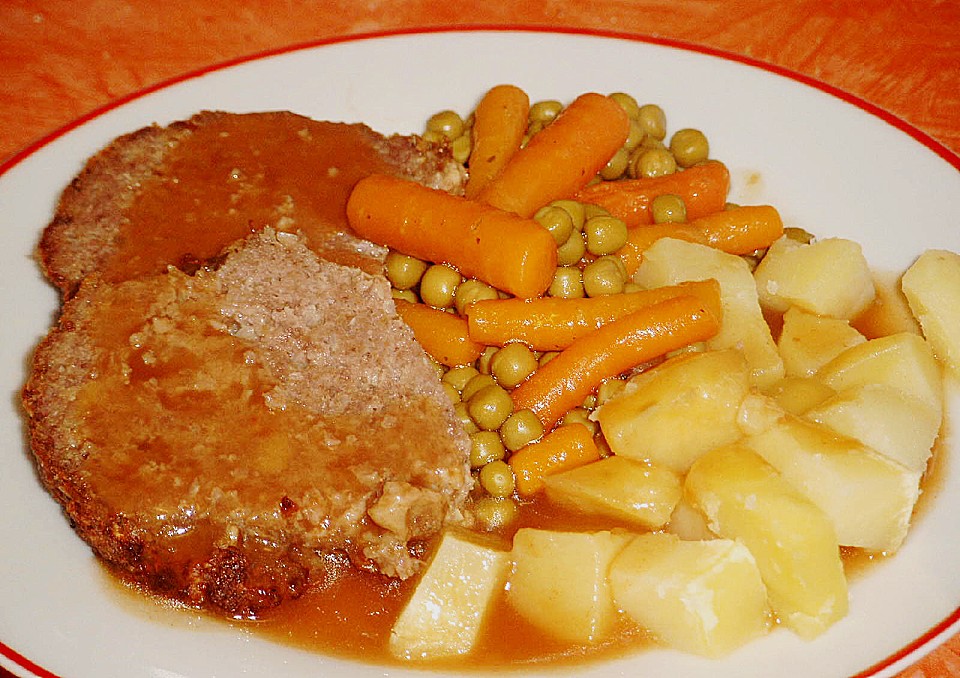 Hackbraten Mit Erbsen Und Mohren Und Kartoffelpuree Rezept Lecker