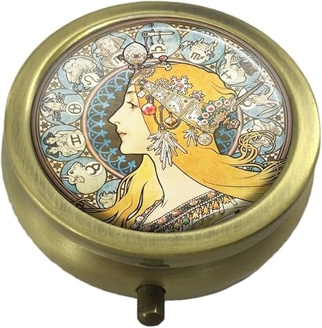 Amazon Com Maxing Alphonse Alfons Mucha Zodiac Circular Custom Personalized Bronze Round Pill Box Decorative Metal Medicine Container Case Home Kitchen