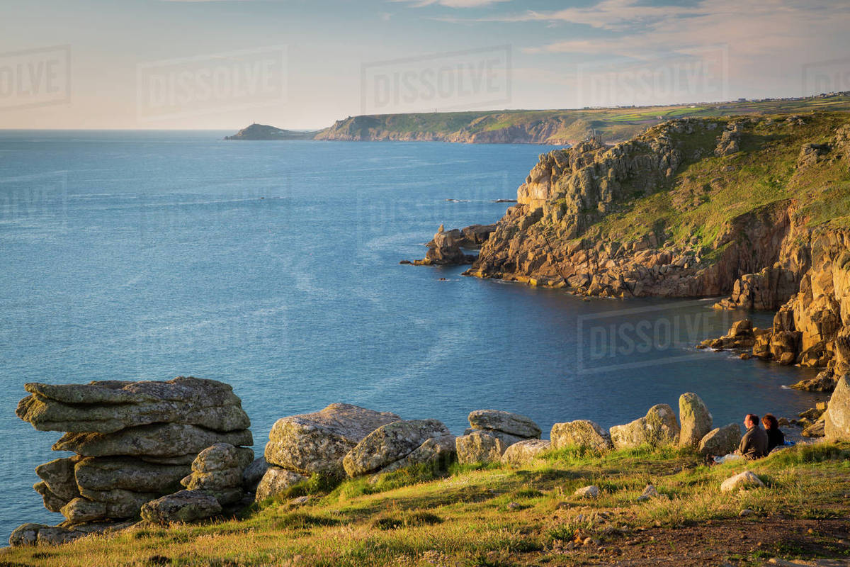 Couple Enjoying Sunset Over The Cliffs Near Lands End Cornwall England Stock Photo Dissolve