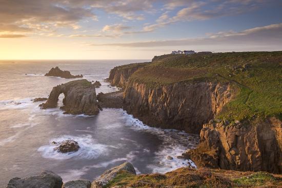 Natural Rock Arch Enys Dodnan Off The Cliffs At Sunset Lands End Cornwall England Great Britain British Isles United Kingdom Uk Stock Photo Alamy