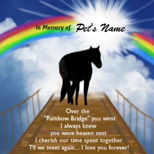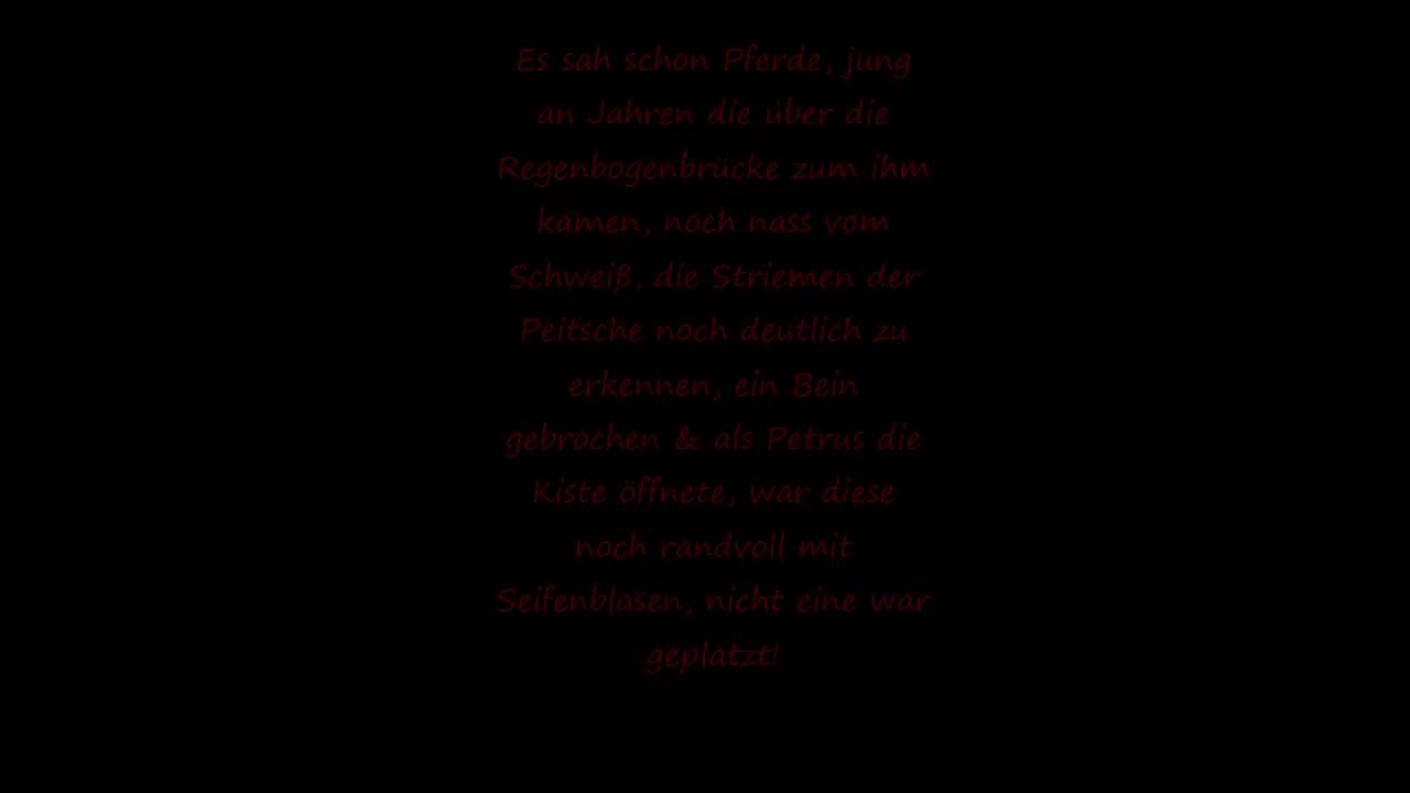 Doch nun müssen wir heute, im Alter von fast Jahren, dich über die Regenbogenbrücke schicken Für uns warst du nicht nur ein Pferd, du gehörtest zu unserer Familie Ein Pferd was einem Anfangs nichts schenkte, aber im Team alles für ein gab Kein Strecke war zu lang, keine Hürde zu hoch oder Wendung zu eng Wenn es zum Turnier ging. Die Regenbogenbrücke Eine Brücke verbindet Himmel und Erde Wegen der vielen Farben nennt man sie “Brücke des Regenbogens” Auf dieser Seite des Regenbogens liegt ein Land mit Wiesen, Hügeln und saftigem, grünen Gras Wenn ein geliebtes Tier auf Erden für immer eingeschlafen ist, geht es zu diesem schönen Ort Dort gibt es immer zu fressen, zu trinken und es ist warm es ist. „Was rühmst du deinen schnellen Ritt!.