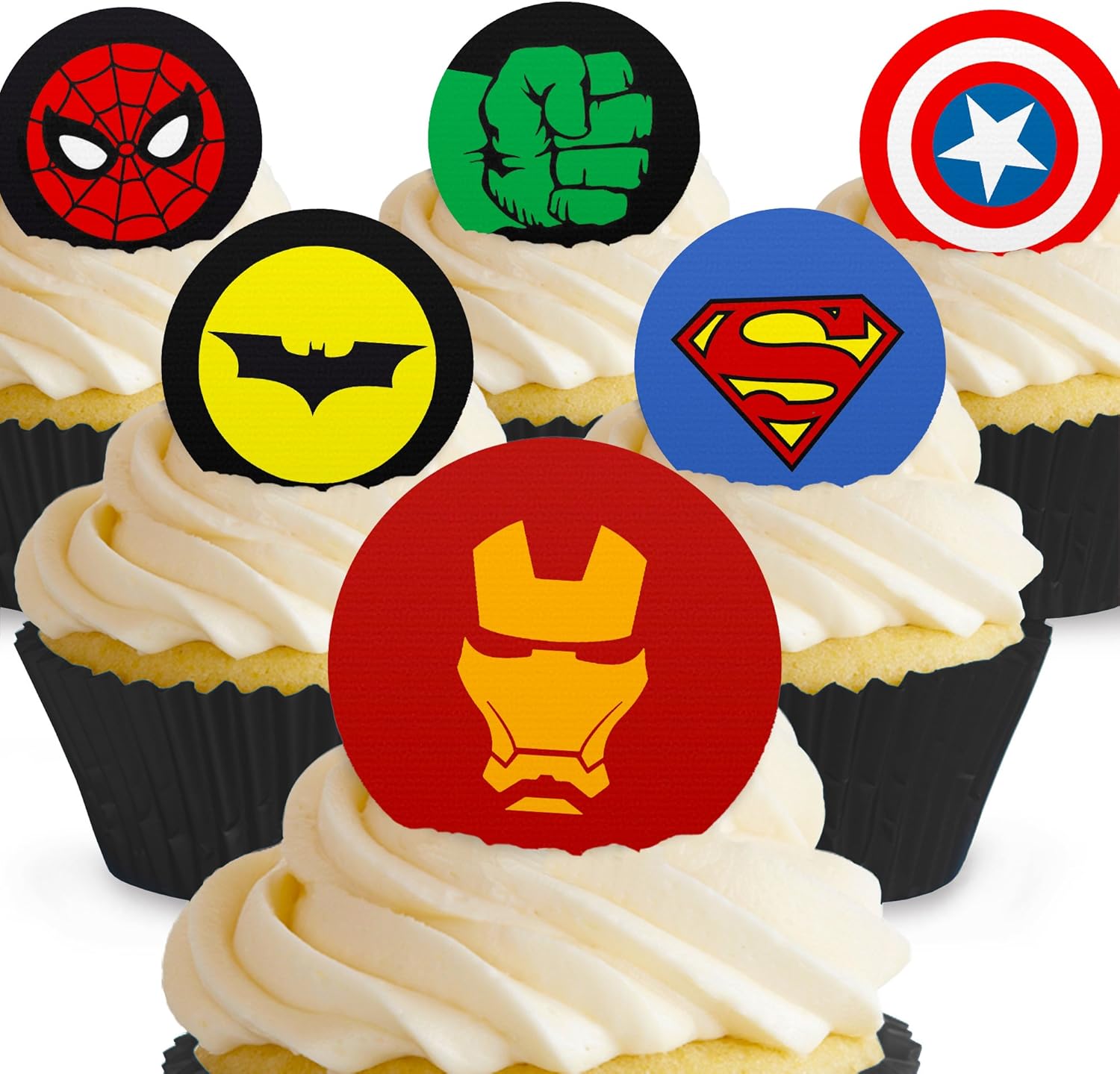 Cakeshop 12 X Vorgeschnittene Und Essbare Superhelden Logos Kuchen Topper Tortenaufleger Amazon De Kuche Haushalt
