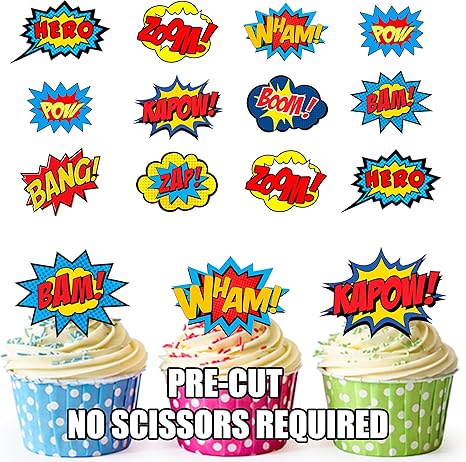Ak Giftshop Tortchen Dekorationen Essbar Vorgeschnitten Superhelden Sprechblasen Motiv Fur Kuchen Cupcakes Und Torten 12 Stuck Amazon De Kuche Haushalt