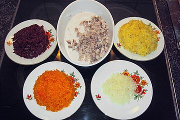 Russischer Schichtsalat Über 18 Bewertungen und für vorzüglich befunden Mit Portionsrechner Kochbuch VideoTipps!. Russischer Schichtsalat mit Matjes (Селёдка под шубой) Der Ysop, den ich an die Majo gemacht habe, harmoniert gut mit den Kartoffeln und der Estragon mit dem Fisch Ihr benötigt ca 300g Matjesfilet oder Hering, 2 bis 3 Zwiebeln, 3 Möhren, 1 Apfel, ca 3 Kartoffeln, 1 kleine Zucchini, 2 Eier, 1 bis 3 rote Rübchen (je nach. Arbeitszeit ca Minuten 30 Minuten für Kochen 24 Stunden im Kühlschrank Hauptspeise Fisch 1 Piraschki gefüllte Hefeteigtaschen mit Buttermilch 2 Russischer Schichtsalat mit Hering und rote Beete.