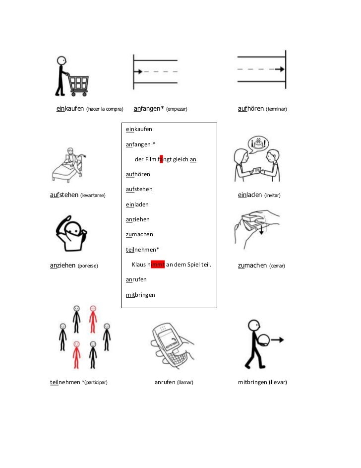 Get your free German Training (with reallife dialogues!) and learn about my 3Plus1 German Academy here 👉 https//learngermanwithanjacom 👈FOLGE MIR FA. 1213 Perfekt mit "sein" 12. Trennbare Verben Memory Ein Spiel zum Wiederholen der trennbaren Verben und anderer Verben aus dem Alltag Die Karten auf dickes Papier drucken, ausschneiden und los geht es Gespielt wird nach den Regeln für Memory die Karten werden verdeckt auf dem Tisch ausgelegt, ein Schüler dreht 2 Karten um;.