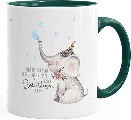 Moonworks Kaffeetasse Elefant Warum Trubsal Blasen Wenn Man Auch Seifenblasen Kann Spruch Motivation Positives Denken Frohlich Grun Unisize Amazon De Kuche Haushalt