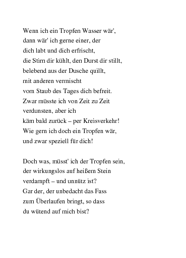 Wasser gedicht grundschule. Deutsche Gedichte kostenlose Gedichte und Sprüche Freundschaft, Liebe, Hochzeit, Geburt uvam WASSER GEDICHTE Gedichte Arnim Busch Eichendorff Goethe Heine Heym Lessing Morgenstern Rilke Ringelnatz. Arbeitsheft für Schülerinnen und Schüler – Grundschule 24 2 Impressum Herausgeber Bundesministerium für Umwelt, Naturschutz, Bau und Reaktorsicherheit (BMUB) 22 Heiliges Wasser 26 23 Das WasserGedicht 27 3 Unser blauer Wasserplanet 6 WASSER IST LEBE 4 17 Bundesministerium für Umwelt, aturschutz, Bau und Reaktorsicherheit 1. WasserGeschichten für Grundschulen Die vier SchülerArbeitshefte der „WasserGeschichten“ und die dazu gehörenden Arbeitsblätter und Begleitinformationen wurden 16 unter Berücksichtigung der aktuellen Lehrpläne zusammen mit pädagogischen Fachkräften inhaltlich und didaktisch weiterentwickelt Sie sind für den Sachunterricht in der Grundschule rund um das Thema Wasser konzipiert und können – je nach Wissensstand der Kinder – ab Jahrgangsstufe 2 genutzt werden.
