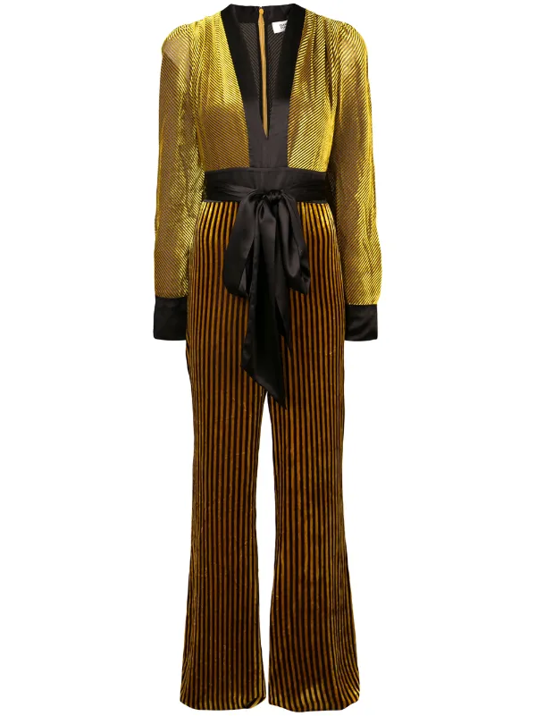 Gold Satin Trimmed Striped Devore Velvet Jumpsuit Diane Von Furstenberg Velvet Jumpsuit Jumpsuit Diane Von Furstenberg