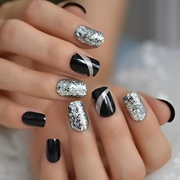 Plzjmm Kunstliche Nagel Raue Silberne Glitter Imitat Kurze Schwarze Nagel Gefalschte Bling Dame Artificial Acrylic Nail Tips Fur Finger Amazon De Beauty