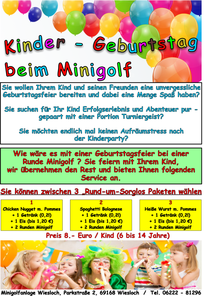 Zazzle bietet dir personalisierte Minigolf Einladungen mit den verschiedensten Designs Hier findest du die perfekten Einladungen für deinen Anlass!. Kinder haben ein paar IDE ein wenig verrückt manchmal, vor allem, wenn es darum geht. 1 x Bratwurst mit Pommes 1 x 0,3l Softgetränk nach Wahl 1 x Kindereintritt Minigolf für 9€ / Kind schon ab einer Gruppengröße von 5 Kindern Kindergeburtstag mit Eis!.