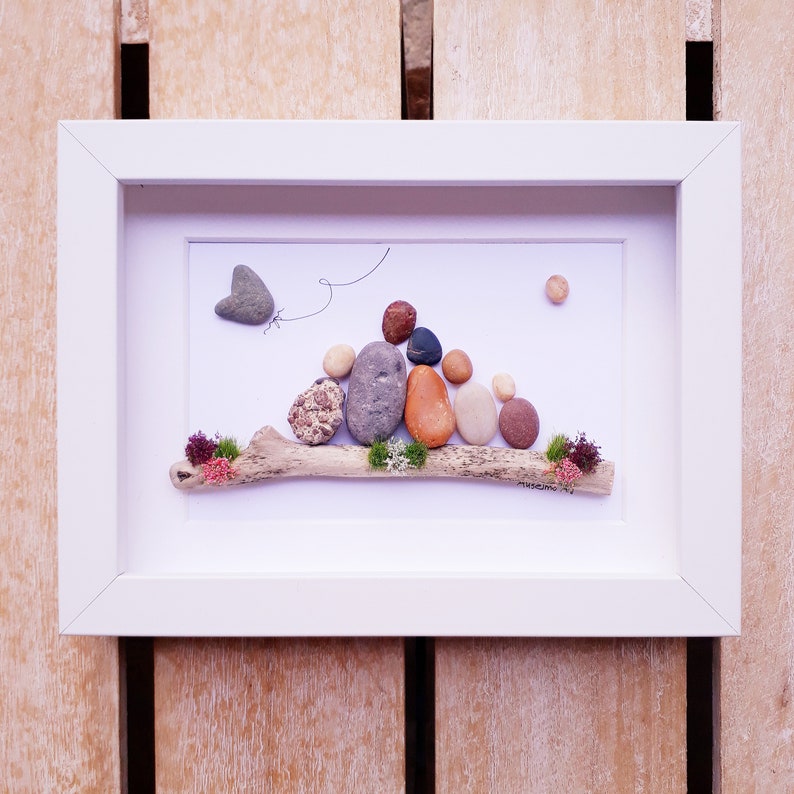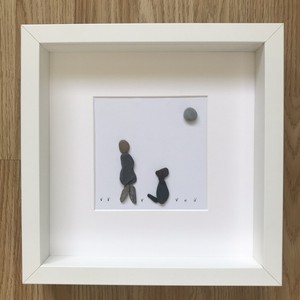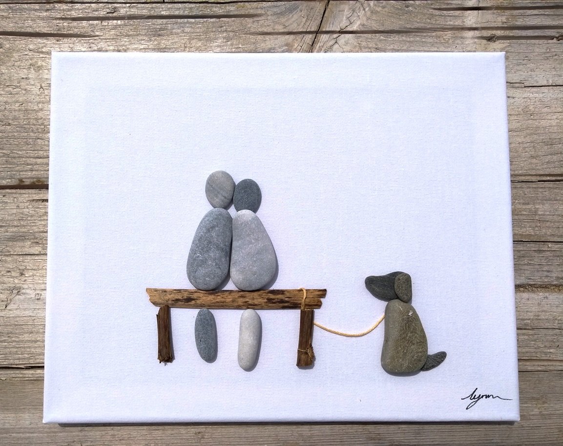 Pebble Art Natural stones, driftwood, bark, twigs and pebbles have all been cleverly arranged to create various whimsical settings No two scenes are alike, as all are created entirely from natural finds whilst on woodland walks and coastal paths. Gift for Dog Lovers Pebble Art Lady Dog Walker Unusual Gifts Etsy A perfect gift for the lady who loves walking her dog This woman, dressed in a long coat, is sitting down on a rock while her dog watches her, eager to carry on with his walk, and a sea glass and slate seagull flies overhead. Handmade family and dog pebble picture sitting a peice of driftwood, a printed blue background with the words "Family" All categories Driftwood Pebble Art Menu.
