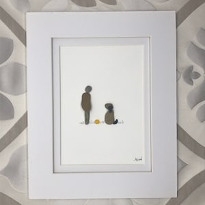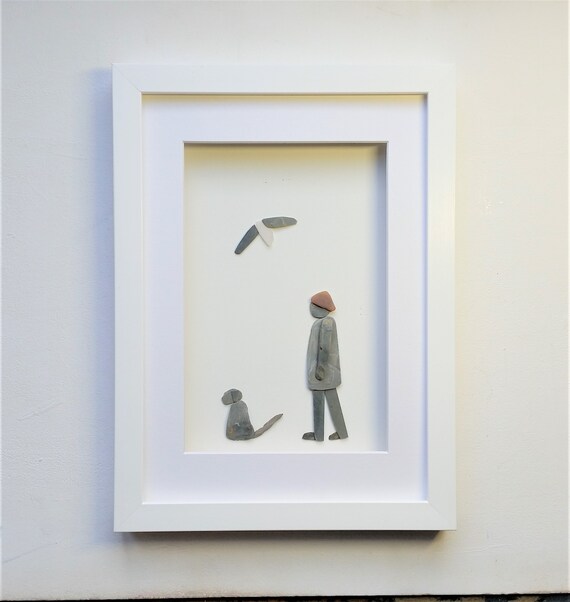 Most of these designs were custom orders or are sold I can replicate many of these designs Each design is an original work of art as the materials are all one of a kind Please send me a message if you would to have a custom. A selection of beautiful pebbles arranged to resemble a person and a dog taking a stroll down to the beach The frame is deep enough to house the picture and includes a protective glass window, white mount, hooks on the back to hang it and a leg to enable freestanding Frame measurements are Length x 23cm Width x 18c. I have made several endearing designs that include family pets and also created scenes for The Winnipeg Humane Society fundraisers Most of these designs were custom orders or are sold I can replicate many of these designs Each design is an original work of art as the materials are all one of a kind Please.