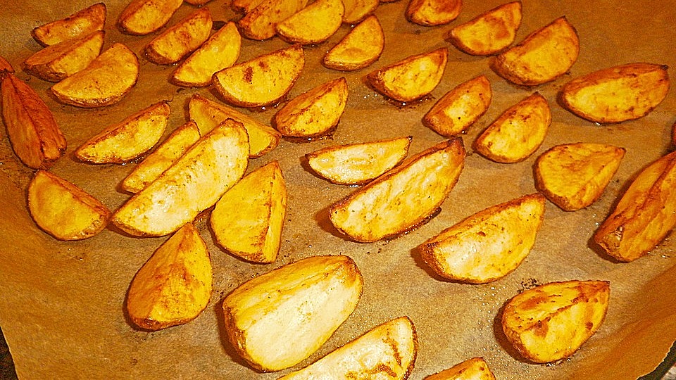 Kartoffelspalten in eine Schüssel geben und mit dem Würzöl gut vermischen, sodass alle Kartoffeln mit Öl benetzt sind Auf einem mit Backpapier ausgelegten Backblech verteilen und im heißen Ofen 4045 Minuten goldbraun backen Dabei gelegentlich wenden, damit sie von allen Seiten gleichmäßig gebacken werden.