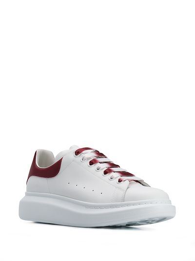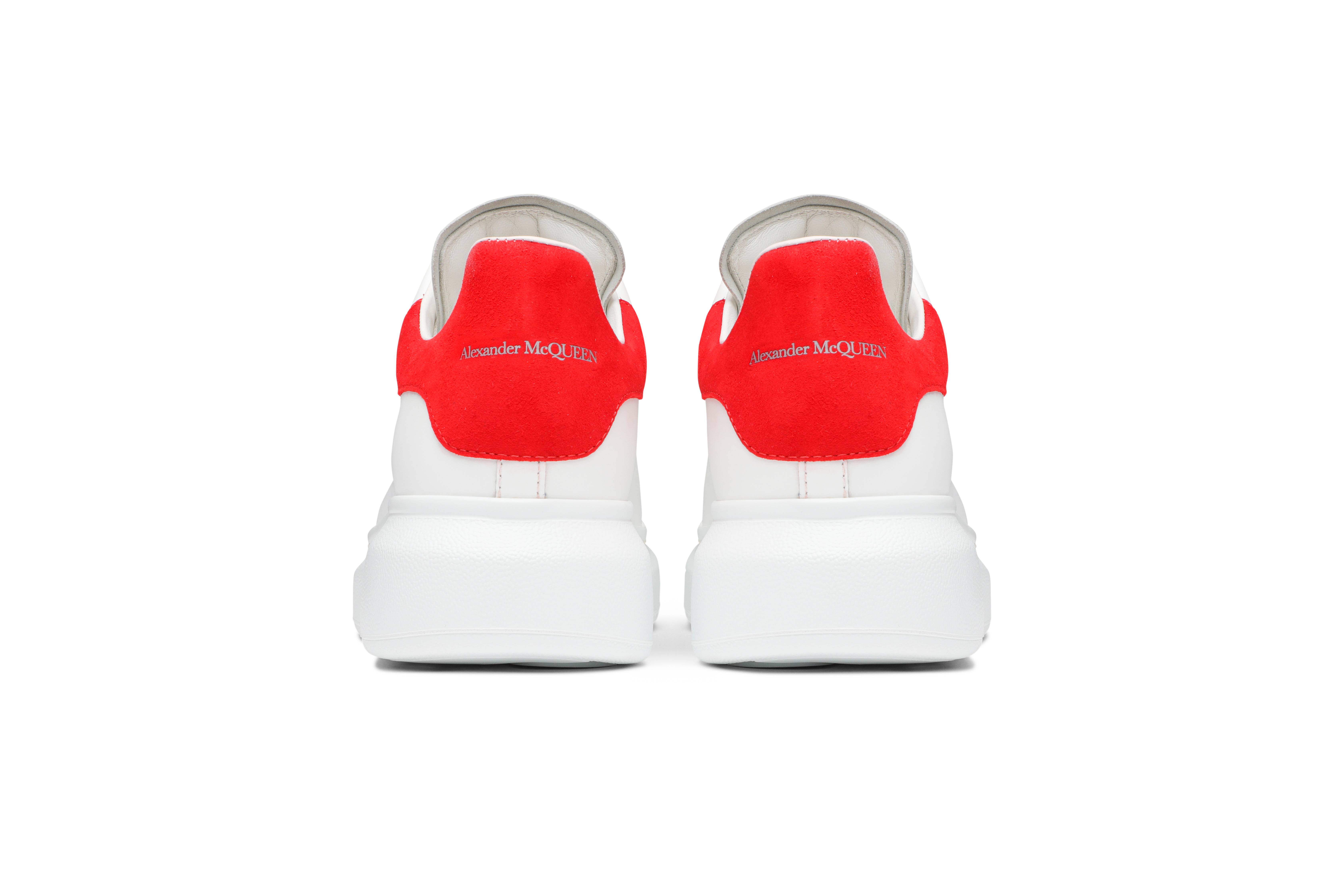 Buy Alexander McQueen White & Red Oversized Sneakers on SSENSEcom and get free shipping & returns in US Lowtop buffed calfskin sneakers in white Round toe Tonal laceup closure Logo stamp in silvertone at padded tongue Padded collar. USD $ USD $700 Alexander McQueen Alexander Mcqueen Woman Runner Twotone Leather Sneakers White Size 365 Delivery Delivery costs apply. White soft calfskin leather laceup sneaker with a lust red suede heel counter The sneaker features large flat laces and an oversized rubber sole Finished with an Alexander McQueen signature on tongue Oversized rubber sole with signature stamp design The sneakers come with an additional set of shoelaces.