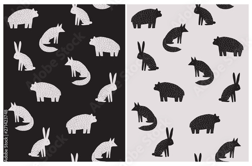 Bear Hare And Foxisolated On A Beige And Black Background Abstract Hand Drawn Woodland Vector Pattern Black And Beige Scandinavian Style Art Simple Forest Animals Design For Card Printing Buy This