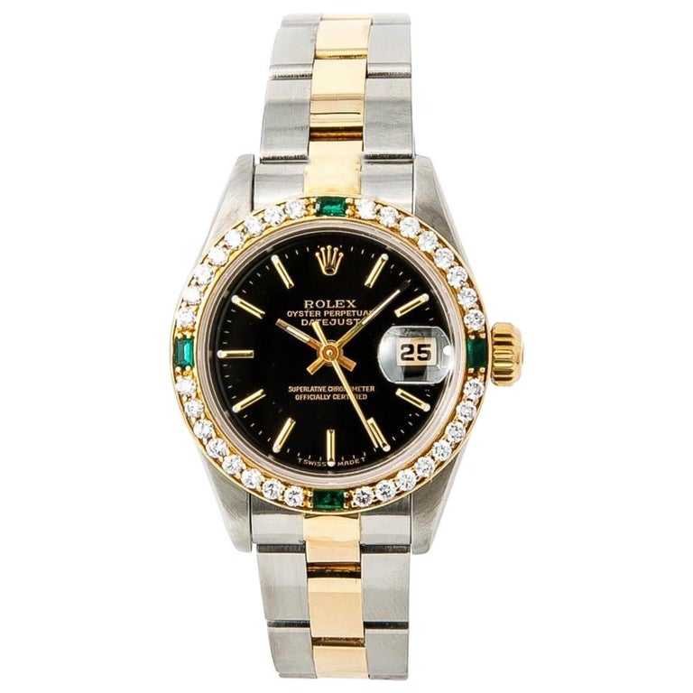 Ladies Rolex Datejust Steel 18k Gold Diamond Emerald Bezel