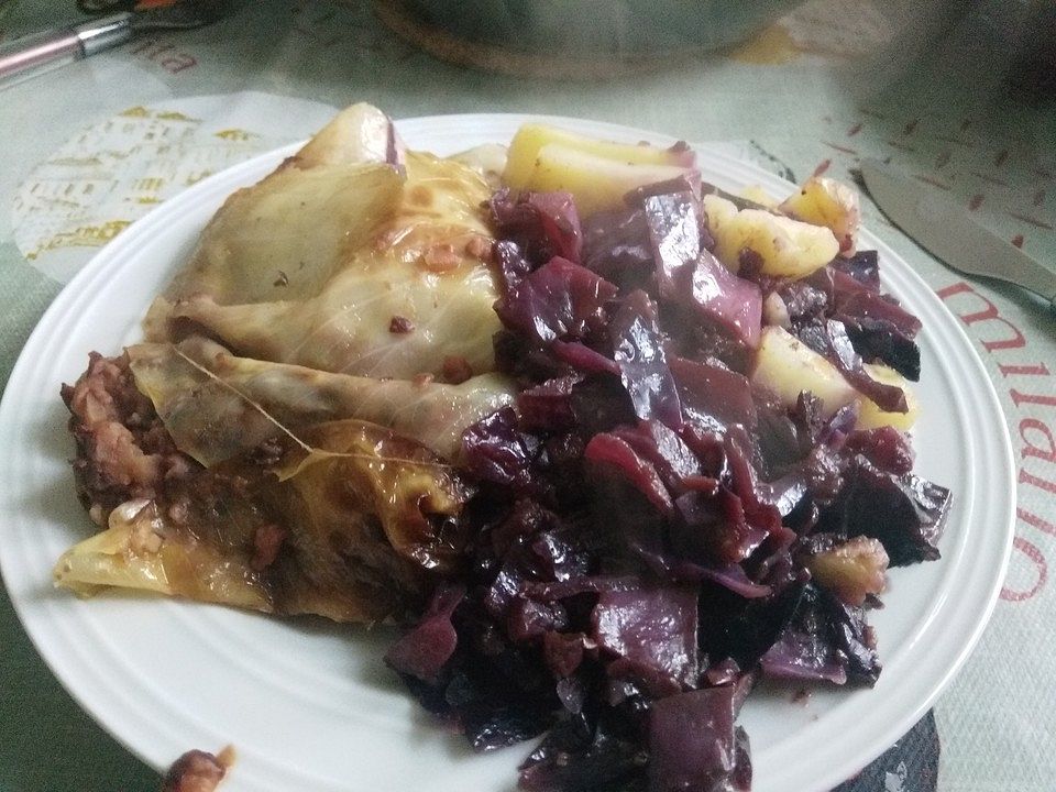 Kohlrouladen Mit Kidneybohnen Zwiebelfullung Und Dazu Rotkraut Und Kartoffeln Von Derschnauder Chefkoch