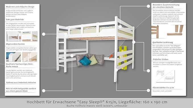 Hochbett Fur Erwachsene Easy Premium Line K15 N Buche Vollholz Massiv Weiss Lackiert Umbaubar Masse 160 X 190 Cm Amazon De Baumarkt