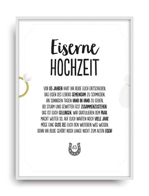 Um ihre Glückwunschkarte mit Leben zu befüllen finden Sie vielerlei Sprüche zur eisernen Hochzeit Schenken Sie mit unseren Texten Einzigartigkeit All unsere Sprüche passen mehr als bequem in eine Glückwunschkarte Selbst für die kleinste Karte zum 65 Hochzeitstag finden Sie einen passenden Spruch bei uns. Drollige oder freche Sprüche zur Goldenen Hochzeit Unter Umständen bietet es sich an, das betreffende Ehepaar ein bisschen provokant anzusprechen – ob vor Publikum oder ganz diskret, gilt es abzuwägen Wer einen etwas derberen Spaß verträgt, amüsiert sich auch über in lustige Wörter verpackte Kritik an der Institution Ehe oder an. Ob romantisch, tiefsinnig oder zum Schmunzeln – viel Spaß beim Stöbern nach Sprüchen zur Goldenen Hochzeit!.