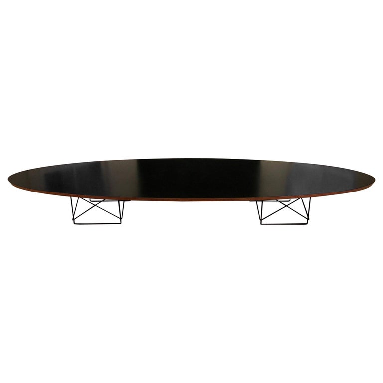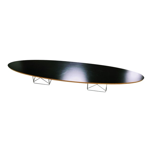 Eames wire base elliptical table, aka surfboard table, in black Table was purchased new and well cared for It was purchased new from Herman Miller's online store We moved and it no longer works with our space layout It has superficial scratches on the surface from normal use. Commonly referred to as the ‘surfboard’, this classic Charles and Ray Eames design pairs an elliptical table top with a double chromed base A midcentury classic, the fixed, static structure works well within both domestic and commercial settings, its mix of playful forms and sleek finishes a hallmark of what’s now referred to as the ‘Eames’ style. Seating Eames Molded Plastic Armchair 4Leg Base Eames® Lounge Chair and Ottoman Eames Molded Plywood Dining Chair Metal Base View all;.