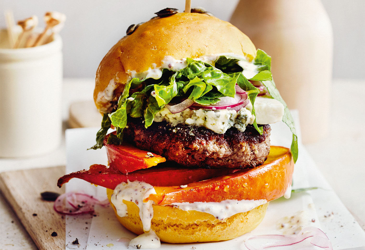 Burger Mit Kurbis Balsamico Zwiebeln Und Preiselbeeren