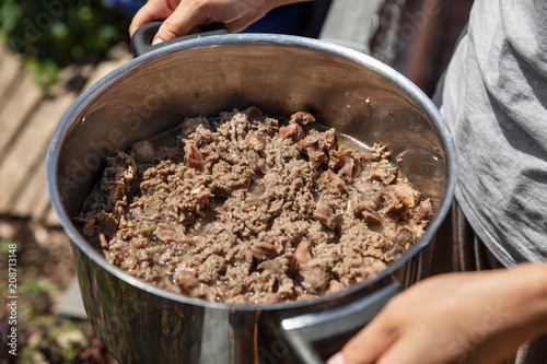 Frau Halt Topf Mit Fleisch Und Innereien Gekocht Hundefutter Oder Katzenfutter Selbstgemacht Buy This Stock Photo And Explore Similar Images At Adobe Stock Adobe Stock